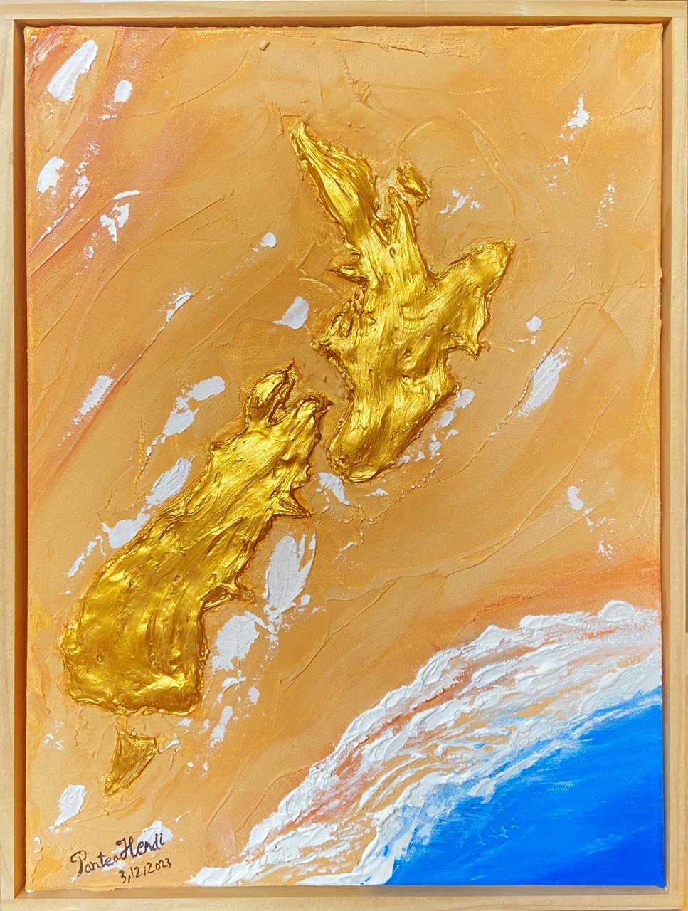 Aotearoa is a striking, textured acrylic painting that celebrates New Zealand’s beauty and identity. The country’s map is rendered in bold golden tones, symbolising richness, pride, and cultural connection. Set against earthy hues with white and blue highlights resembling ocean waves, the piece reflects the harmony of land and sea that defines Aotearoa. The use of thick acrylic impasto creates a sculptural, three-dimensional effect, bringing the map to life with elegance and strength. This artwork serves as a powerful tribute to New Zealand, the Land of the Long White Cloud, embodying both heritage and natural wonder.