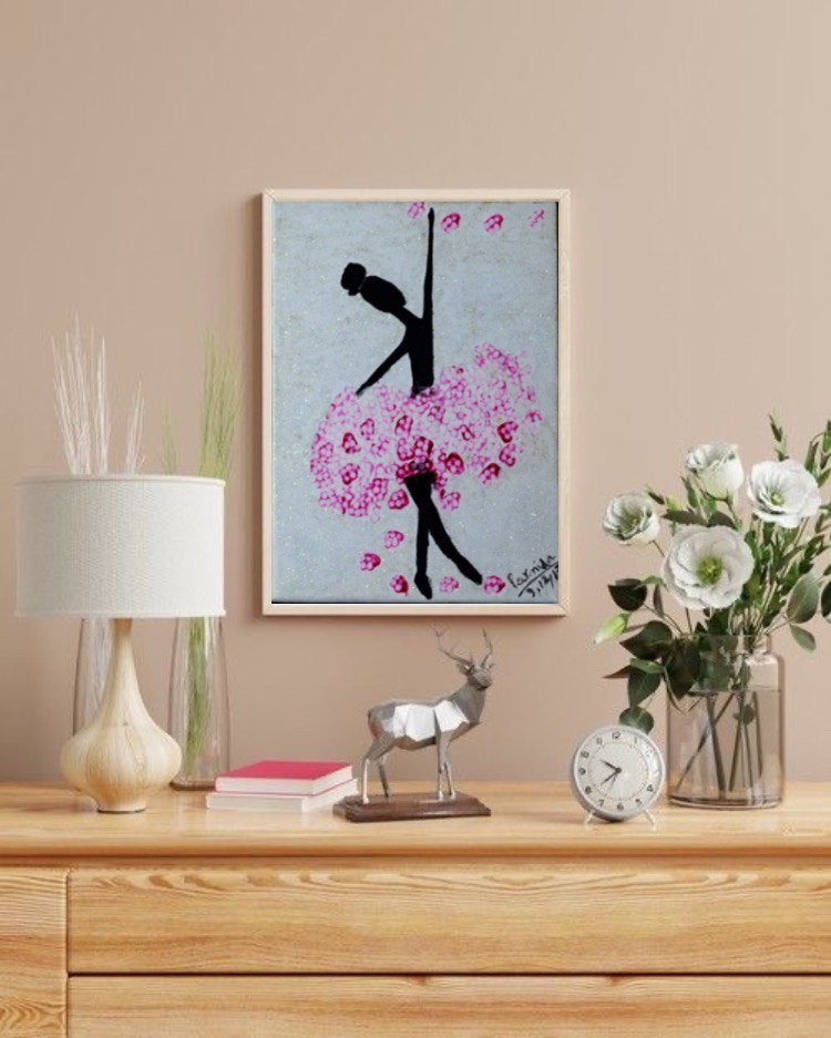 This expressive ballerina painting captures the beauty of dance through minimalistic elegance and vibrant detail. The dancer’s silhouette, painted in bold black, stands gracefully poised against a shimmering background, symbolizing strength and balance. Her skirt, designed with bursts of pink floral patterns, adds movement and charm, creating a striking contrast with the simplicity of her form. The scattered blossoms around her enhance the sense of rhythm and flow, giving the artwork a lively yet graceful energy. Perfect for modern interiors, dance enthusiasts, or art lovers, this piece brings inspiration, charm, and a touch of sophistication to any living or creative space.