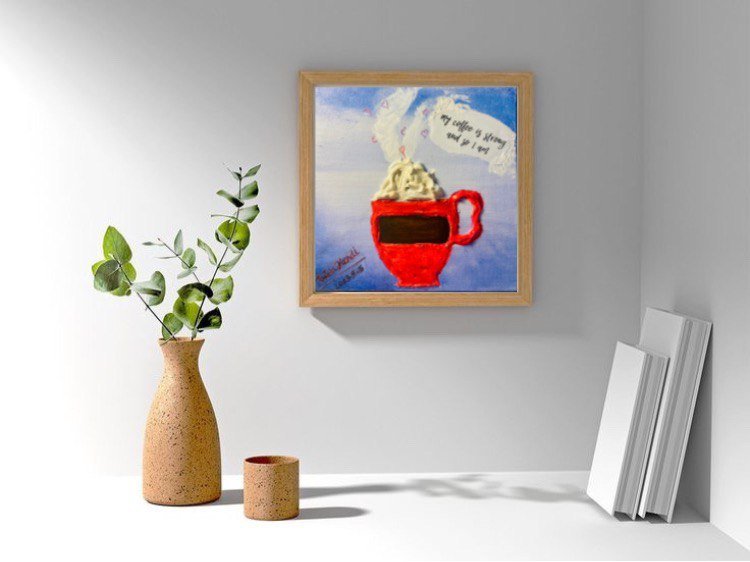 Coffee is a playful and uplifting painting that celebrates warmth, energy, and self-empowerment. At its center, a bold red cup brims with rich, dark coffee topped by a swirl of textured cream. Wisps of steam rise upward, shaped with delicate heart outlines, carrying both comfort and affection into the sky. The soft blue background enhances the sense of calm and morning freshness, while the handwritten phrase “my coffee is strong and so I am” ties the work to resilience and inner strength. A blend of cozy charm and motivational spirit, Coffee embodies the joy found in life’s simple rituals and the power they give us each day.