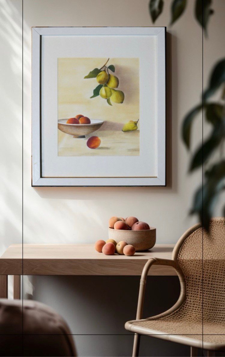 Fruits is a delicate still-life painting that captures the quiet beauty of simplicity and nature’s abundance. A wooden bowl filled with ripe, glowing peaches sits gracefully on a light-toned surface, their warm orange hues radiating life and sweetness. One peach rests outside the bowl, adding a sense of natural movement and balance. Above, a cluster of golden pears with rich green leaves dangles from a branch, while another pear rests quietly on the table, grounding the composition. The soft, muted background enhances the luminous colors of the fruits, giving them a timeless presence. With its refined composition and serene palette, Fruits evokes harmony, nourishment, and the gentle elegance of everyday life.