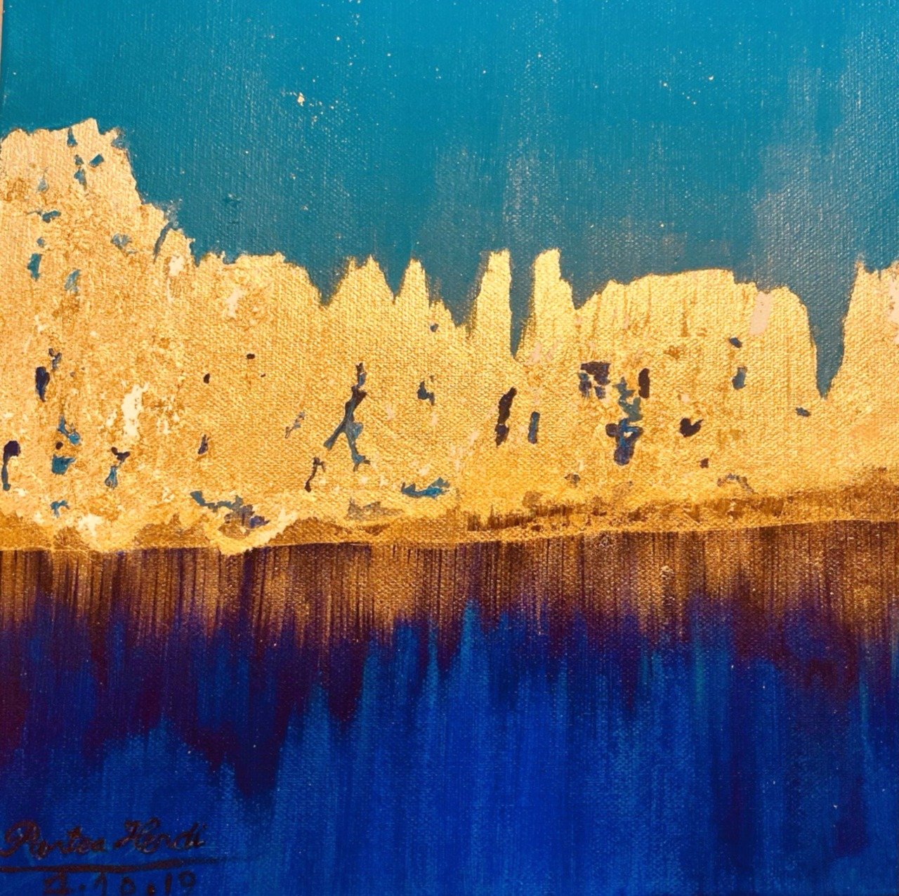 Golden Horizon 2 by P. Hendi blends radiant gold with deep blues, evoking landscapes of sky, sea, and light. A poetic abstract work symbolizing harmony, balance, and the beauty of transition.