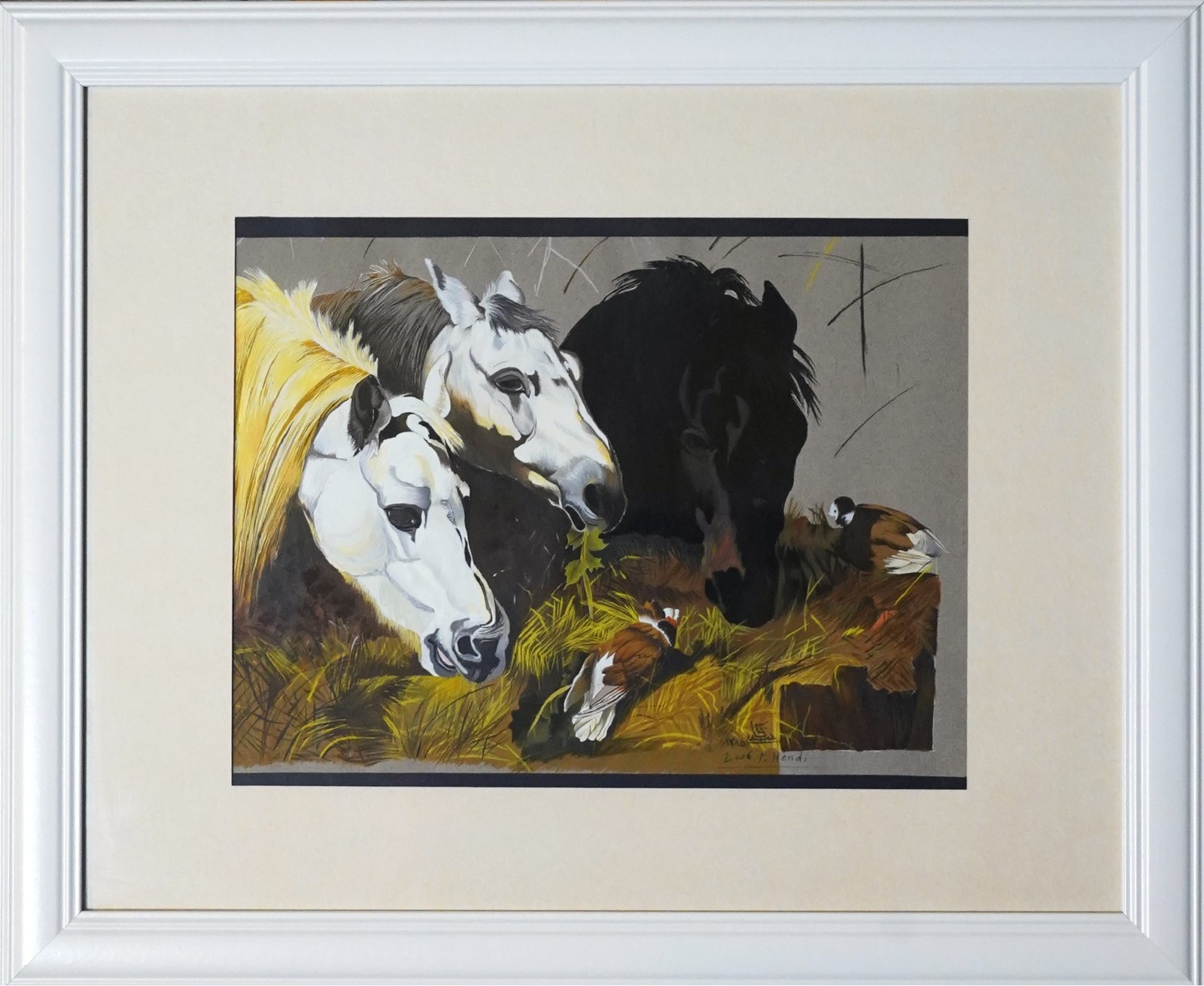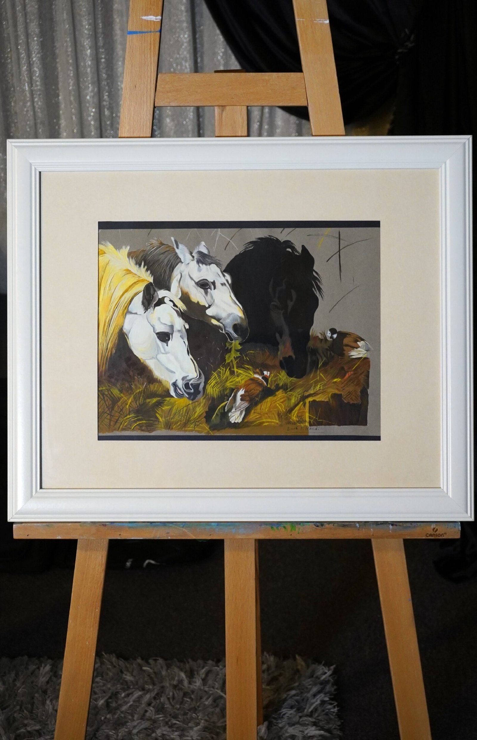 Horse depicts a tender and harmonious moment in nature, where three horses—two pale with white coats and one deep black—are gathered closely, their heads bent together in calm stillness. The artist captures the contrasting beauty of their colors, with the golden mane of one horse glowing against the darker shades, creating a striking balance between light and shadow.