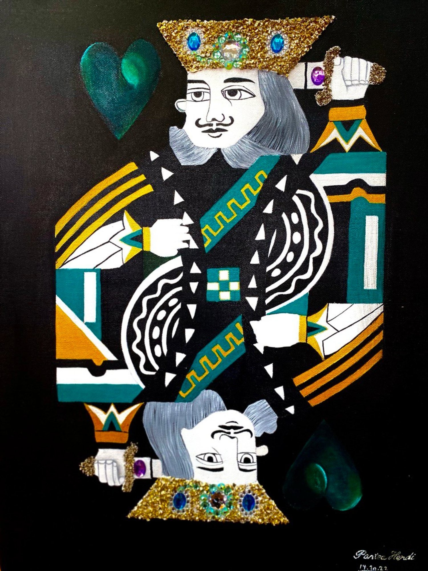 This piece elevates a familiar cultural icon into a fine artwork, transforming the king from a simple card figure into a majestic, almost mythical symbol of leadership, duality, and destiny.