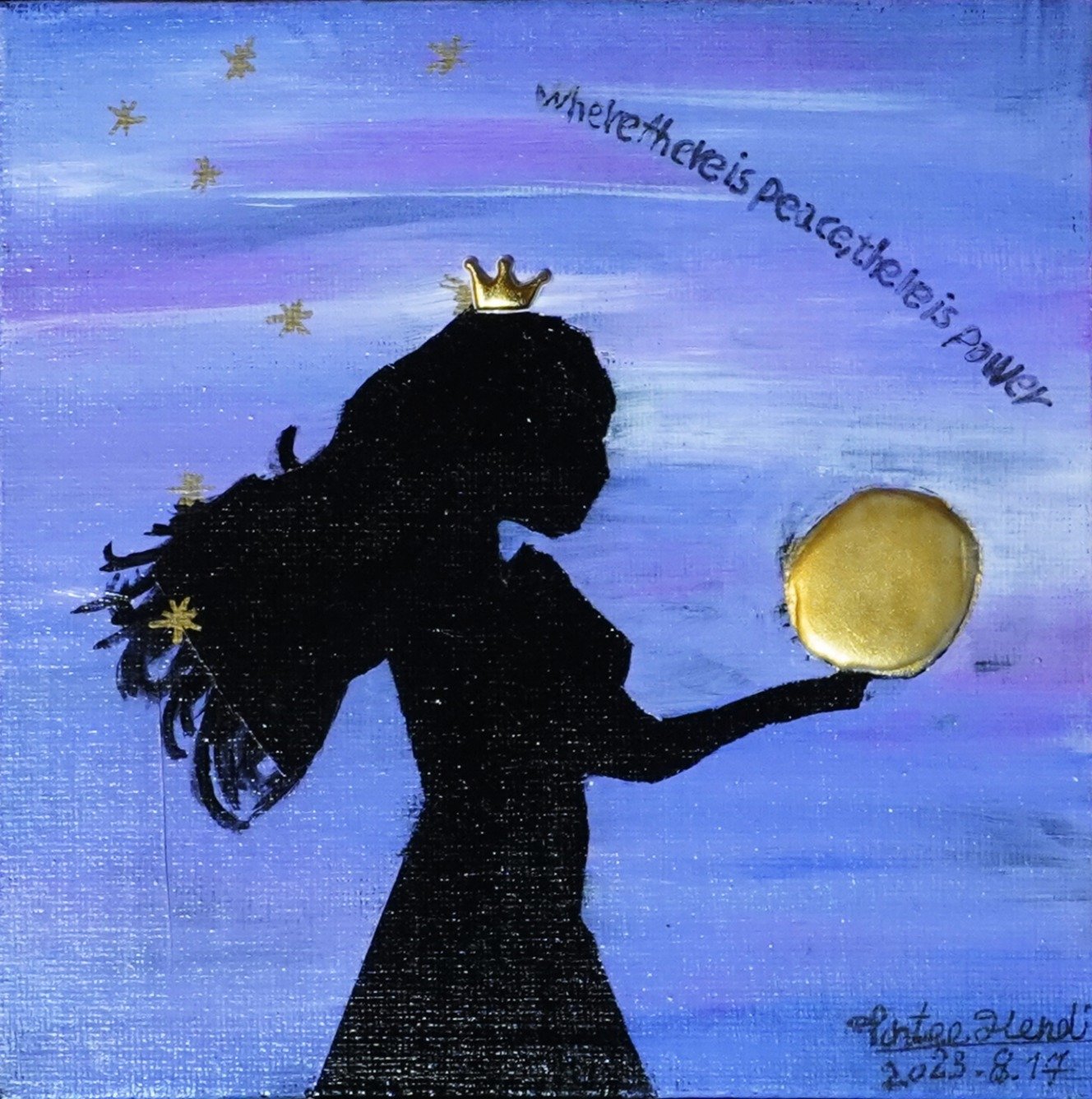 Golden stars twinkle gently in the sky, surrounding her with celestial energy, while the words “Where there is peace, there is power” curve gracefully above her, anchoring the painting’s message. The silhouette style emphasizes universality — she could be anyone, every woman, every soul seeking balance between serenity and strength.