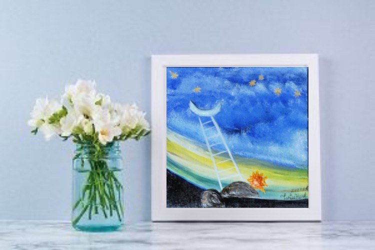 Sunny Moon presents a dreamlike cosmic landscape where the boundaries between day and night dissolve. A glowing crescent moon rests gently at the top of a white ladder, symbolizing aspiration, spiritual ascent, or the pursuit of dreams. The ladder, rising from dark rocky ground, connects earthly struggles with celestial beauty, creating a poetic bridge between the human and the divine.
