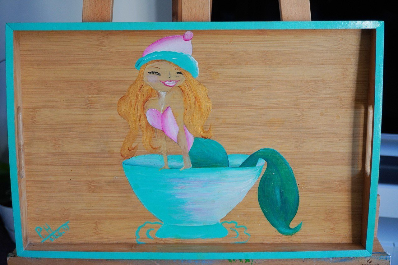 Tray Girl is a playful, whimsical painting that brings together fantasy and everyday life. On a wooden tray, a charming mermaid with long golden hair emerges from a turquoise bowl, her vibrant green tail curling gracefully out of the vessel. She wears a pink seashell-inspired top and a cozy pink-and-teal winter hat, creating a delightful contrast between oceanic fantasy and homely warmth.