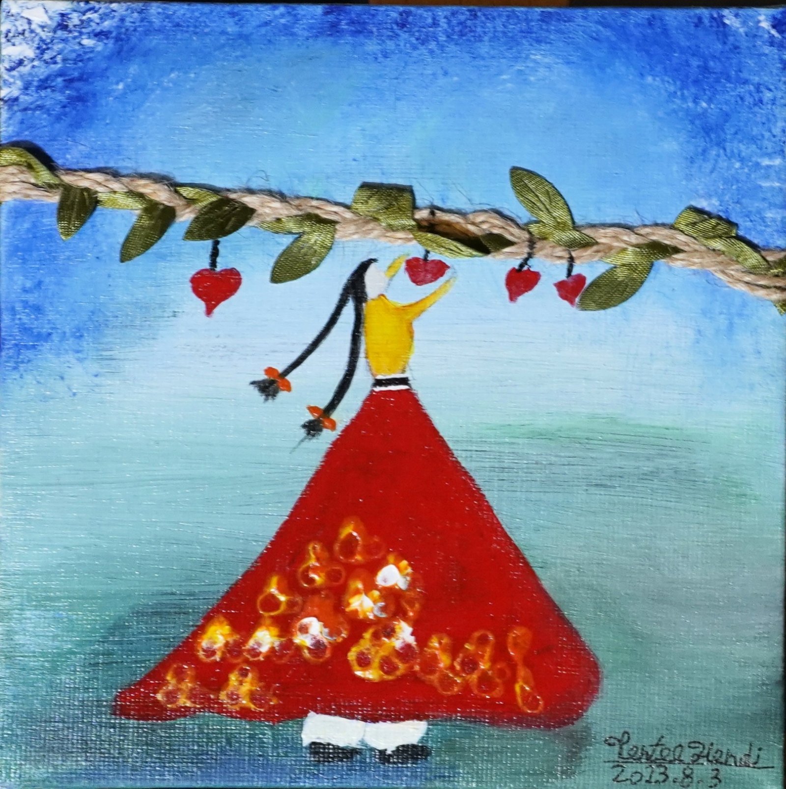 Village Girl portrays a playful figure in a red dress reaching for heart-shaped fruits on a leafy rope. Mixing paint and fabric, it radiates innocence, whimsy, and folk charm.