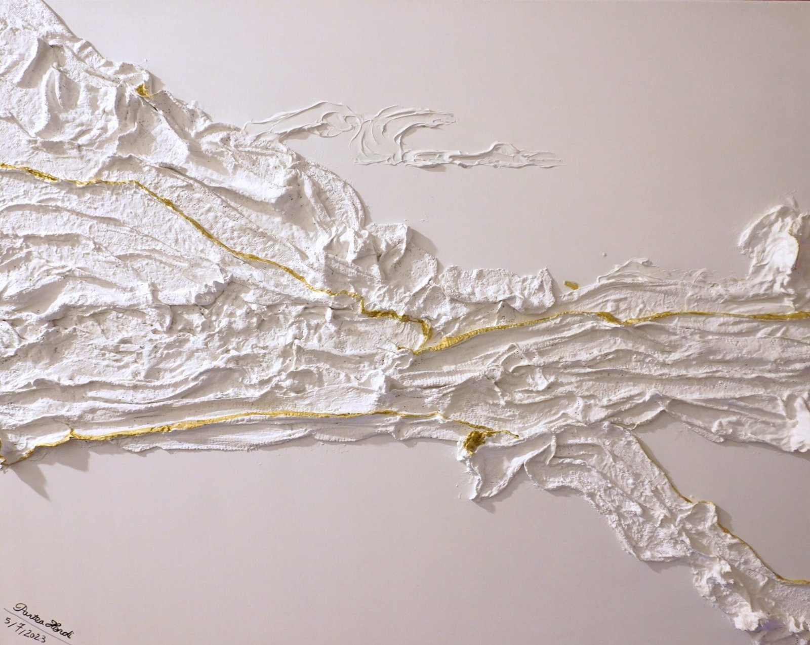 Whispers of the Earth is a textured abstract painting where white ridges flow like mountains or glaciers, cut with gold veins—symbolizing nature’s quiet strength, resilience, and hidden beauty beneath the surface.